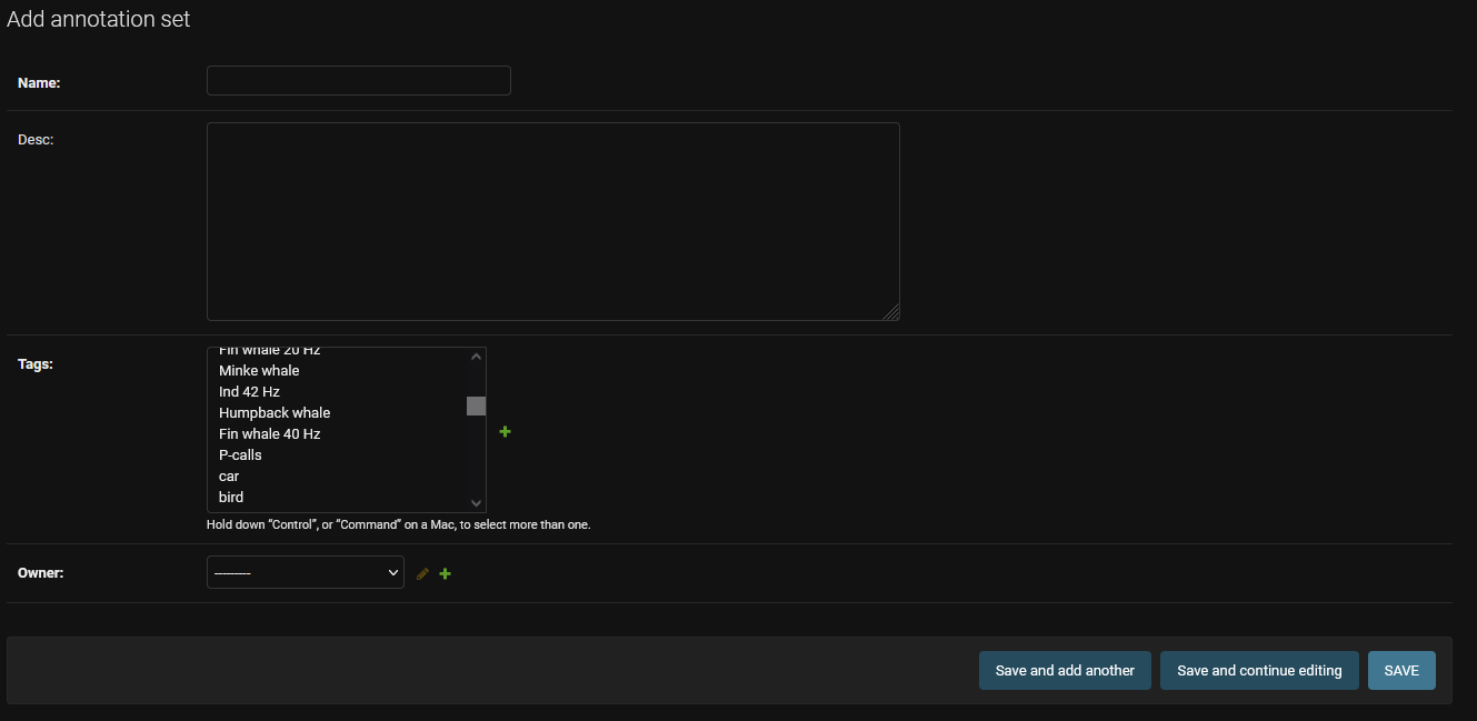 You can fill in the form with the name of your set, the owner (you), and select the labels you need for your annotation campaigns. If you do not find the desired labels, you can click on the “+” button close to the labels list to create a new label.