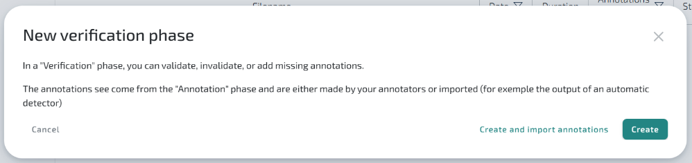- "Verification": Verification phases are used to validate/invalidate annotations made in the “Annotation” phase. If a user is assigned to both phases, he will not be able to validate his own annotations.