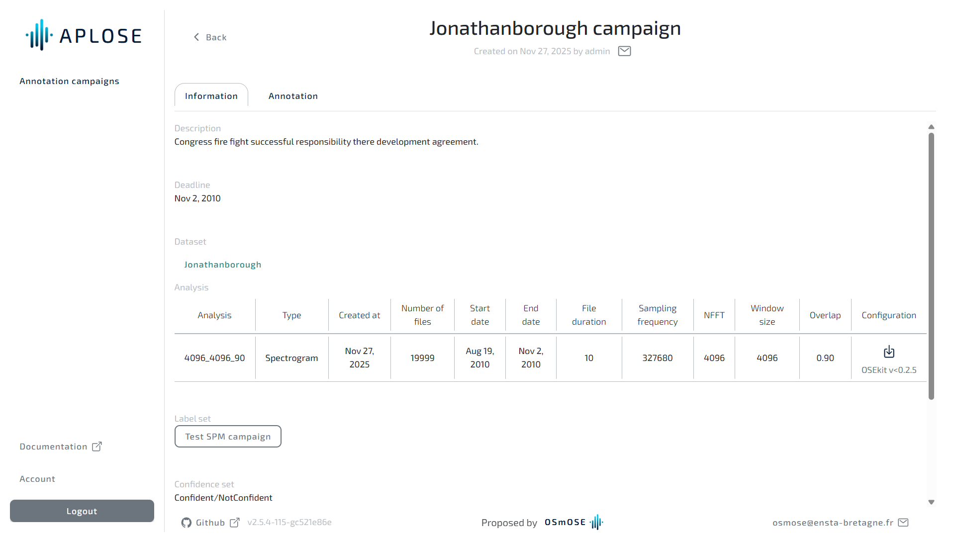 A campaign refers to the annotations of a dataset with a defined set of labels and tasks. Each campaign is defined by a name, a dataset and spectrogram configurations. A campaign is made up of phases.