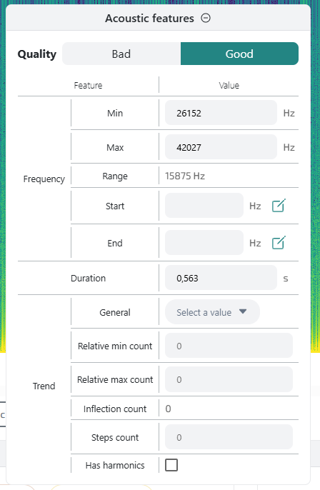 | Frequency start/end | Hz | Frequency of the start/end of the signal. Can be picked directly on the spectrogram thanks to the pencil button |