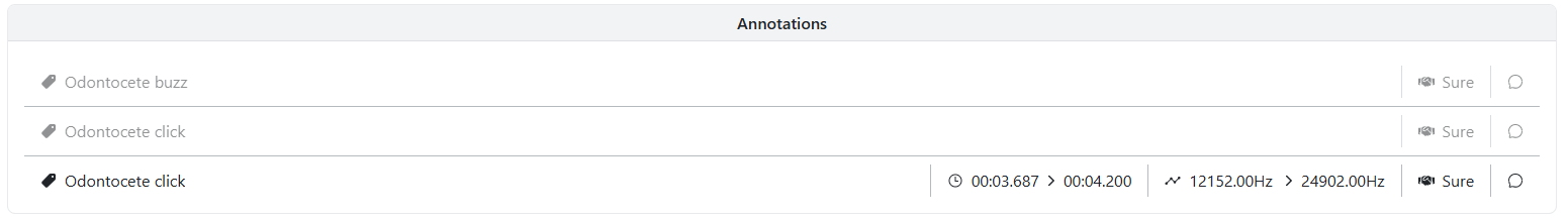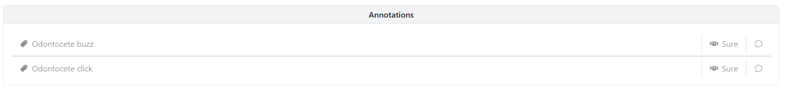 The comment icon changed based one the existence of a comment: the buble is filled if a comment exists for the annotation or task. This information is displayed for each annotation in the "Annotations" bloc or in its header on the spectrogram, and for the task on the "Task Comment" button at the bottom of the "Comments" bloc.