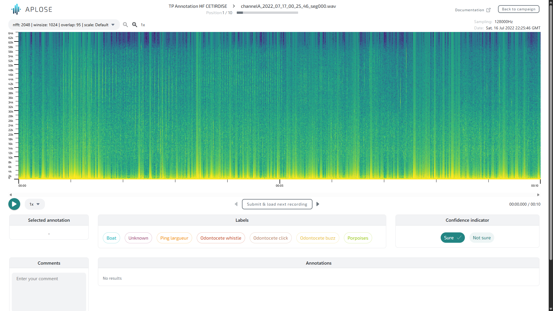 The annotator is the main page of APLOSE. It allows to annotate audio recordings thanks to their spectrogram.