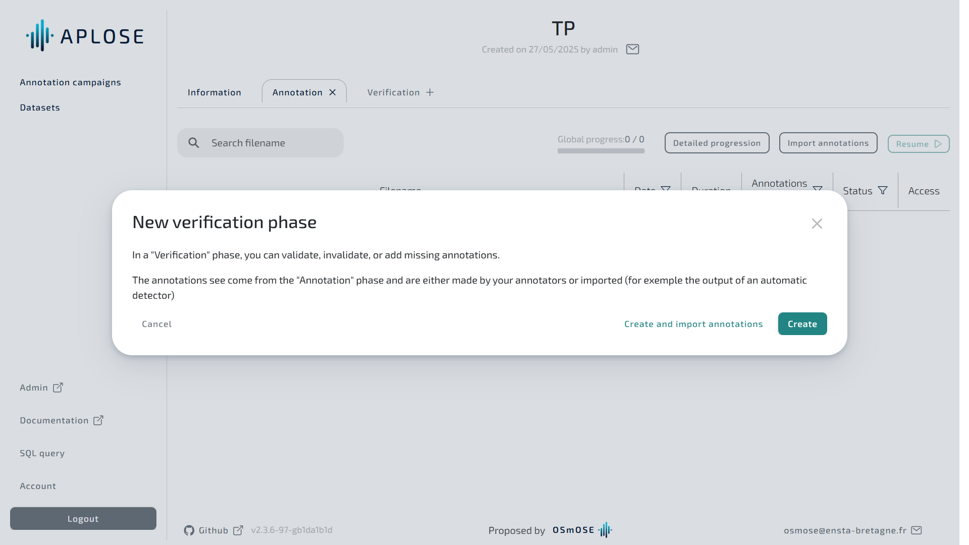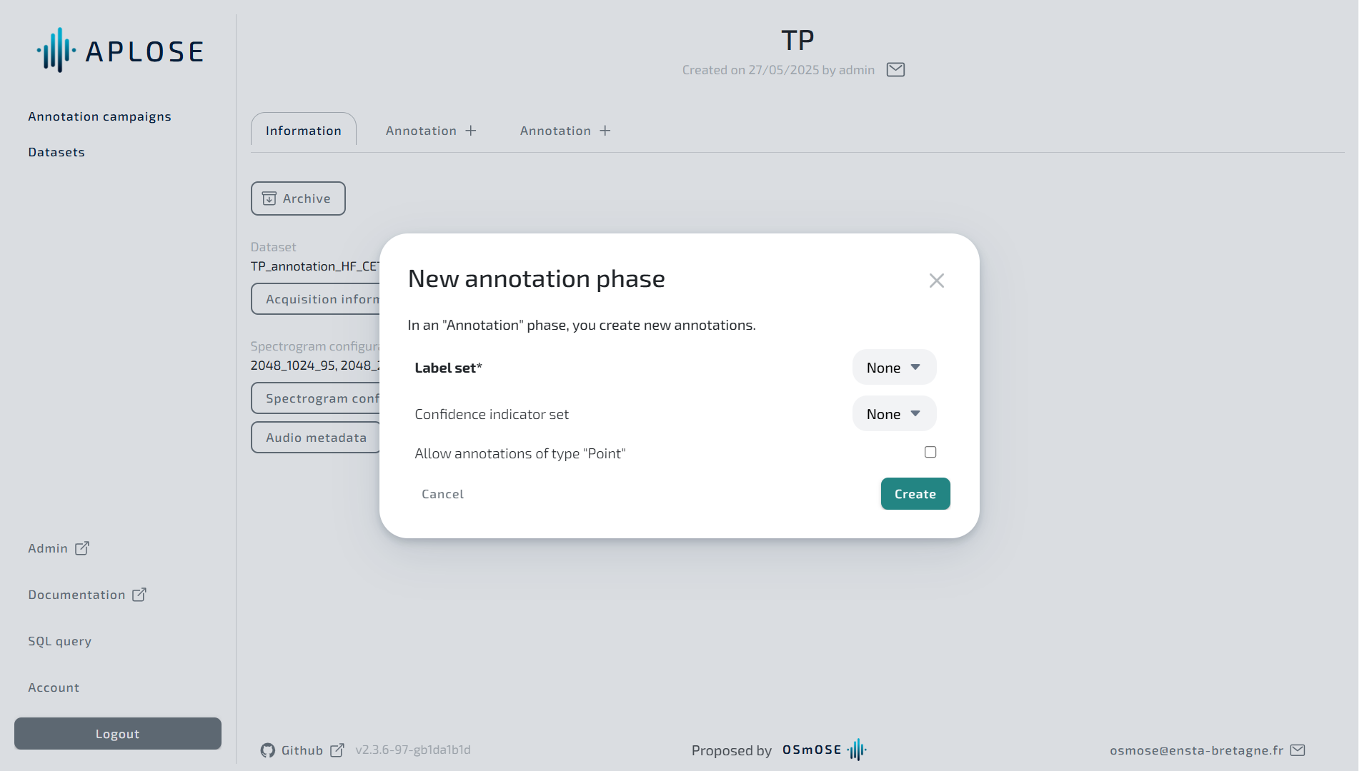 - "Annotation": This type of phase is used to make an initial annotation of the campaign, based on empty spectrograms. This type of phase can also be used to import external annotations, for example from automatic detectors.