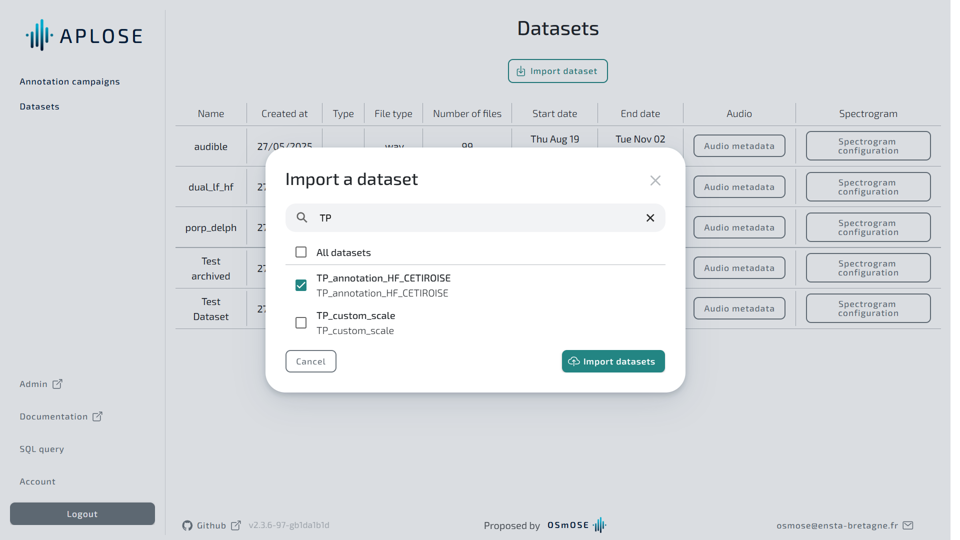 In the modal you can see the list of datasets available for import. You can search for the desired one, select one or more datasets. When you made your choice click on the “Import datasets into APLOSE” to confirm your import.